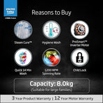 Key Performance Features: Steam Wash Technology, Hygiene Wash Program, Energy Efficient Pro Smart Inverter Motor, Durable body, Quick 14 mins wash program